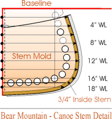 The stem offsets are horizontal measurements from the station listed in the table to the outside edge of the inside stem. Therefore the stem mold that you make should be cut back to allow for the thickness of the inside stem (normally 3/4" on the canoes). Units are feet-inches and eighths, +=sixteenth. See sketch below.